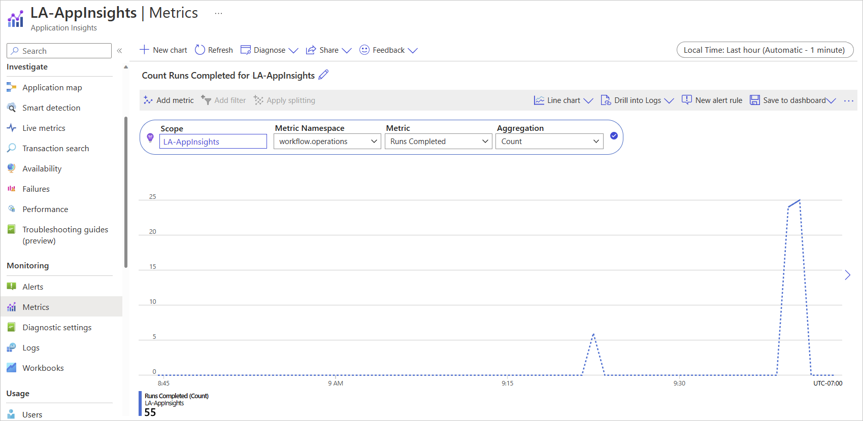 在 Application Insights 中,你可以为标准逻辑应用资源启用增强遥测收集,然后在工作流完成运行后查看收集的数据。 此功能为你提供了一种简化体验,可以发现有关工作流的见解,并对数据源的筛选事件进行更多控制,从而帮助你降低存储成本。 这些改进侧重于实时性能指标,通过指标可以了解系统运行状况和行为。 这可帮助你更早地主动检测和解决问题。