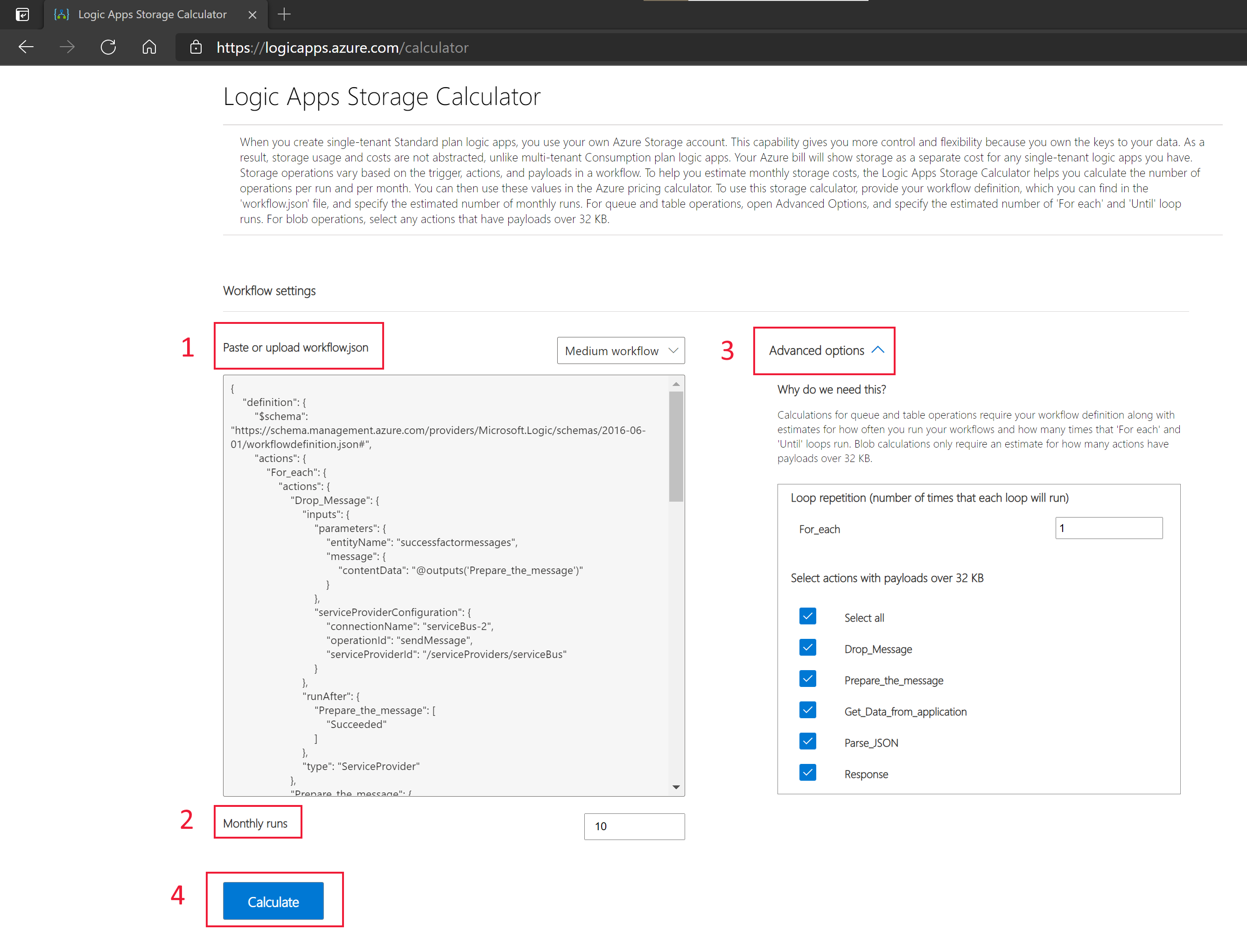 转到逻辑应用存储计算器。