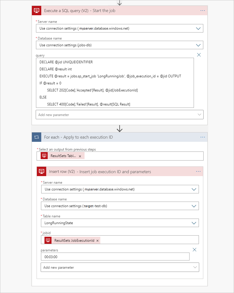 若要启动作业,请使用直通模式查询与 jobid 属性提供输入,Azure 逻辑应用会添加一个 For each 循环,遍历前一步骤的表输出。 对于每个作业执行 ID,请运行一个插入行操作,该操作使用命名为 的动态数据输出来添加作业参数,并将其解压缩后传递到目标存储过程。