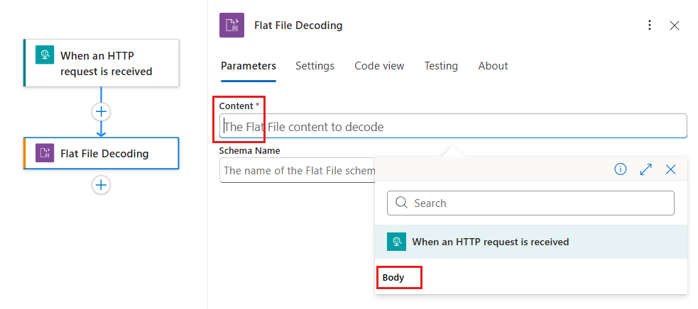 如果 正文 未显示在动态内容列表中,请在 “收到 HTTP 请求时 ”部分标签旁边选择“ 查看更多”。 还可以直接在“内容”框中输入要编码的内容。