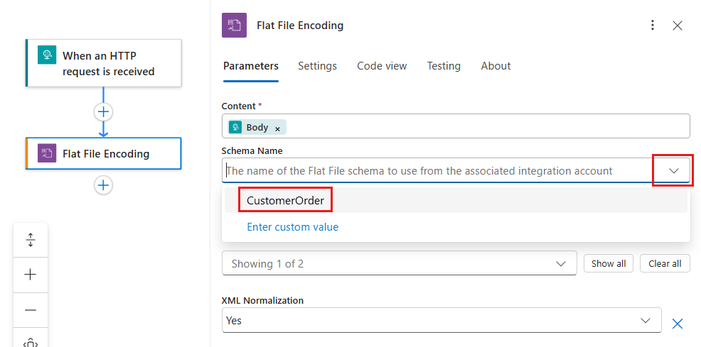 在标准工作流中,平面文件操作允许你从链接的集成帐户中选择架构,或者选择之前上传到逻辑应用的架构,但不能同时从两者中选择。