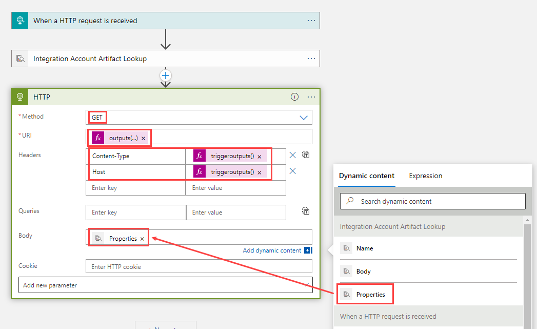2. 在动态内容列表中的“集成帐户项目查找”下,选择“属性”。对于示例方案,HTTP 操作使用以下示例值: