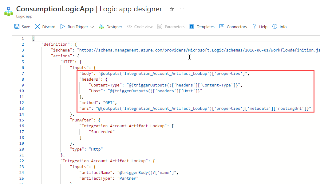 若要确认 HTTP作中的信息,请查看工作流的基础 JSON 定义。 在设计器工具栏上选择“代码视图”。