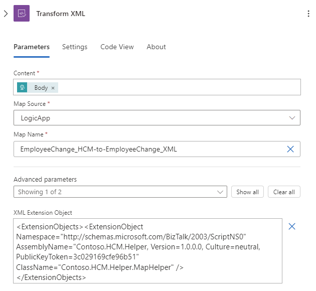 转换 XML 操作支持从映射引用外部程序集,从而直接从 XSLT 映射调用自定义 .NET 代码。 有关详细信息,请参阅在 Azure 逻辑应用中添加工作流的 XSLT 映射。