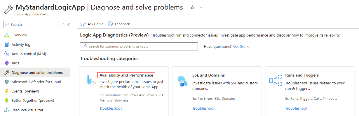 在逻辑应用菜单上,选择“诊断并解决问题”。