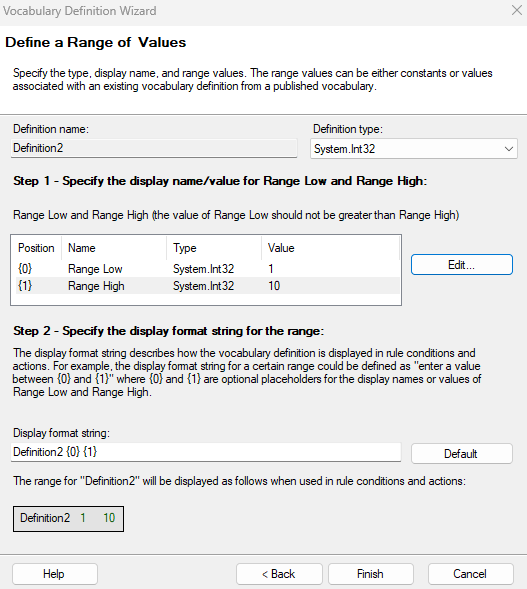 {0}和{1}),以用作范围上限参数和范围下限参数的占位符。以下示例显示了一系列值的示例词汇定义: