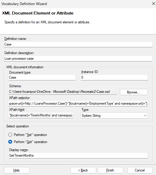 为 XML 节点创建词汇定义时,绑定的 XPath 表达式具有类似的默认值,具体取决于前面所述的规则。 不过,可以在词汇定义向导中编辑这些值。 对表达式所做的更改放在词汇定义中,并反映在根据词汇定义生成的所有规则参数中。