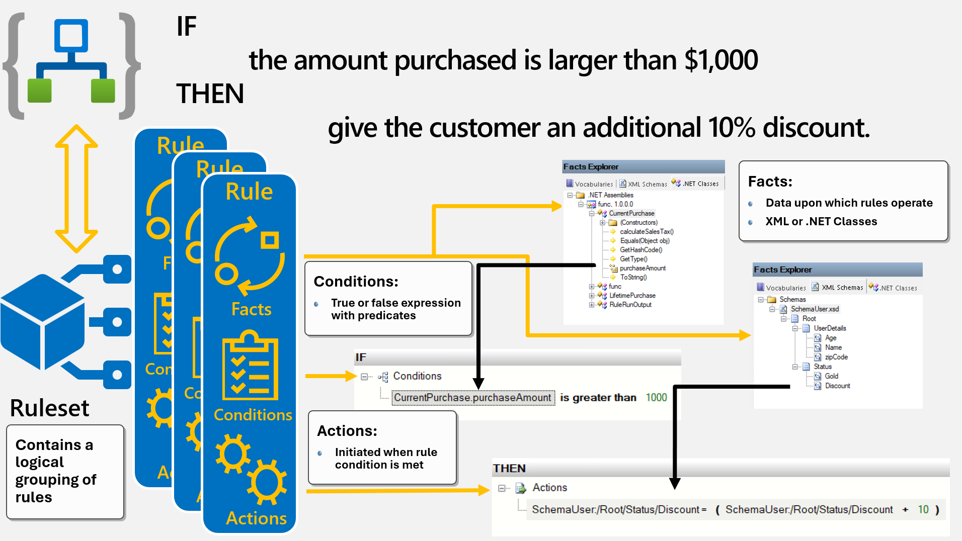 操作:操作是条件评估的功能结果。 满足规则条件时就会启动相应的操作。 在我们的示例中,提供额外的折扣是仅在条件为 true 时发生的操作,即如果 (IF) 购买的金额大于 $1,000。 操作通过调用方法、设置对象的属性或对 XML 文档执行“设置”操作,在 Azure 逻辑应用规则引擎中表示。