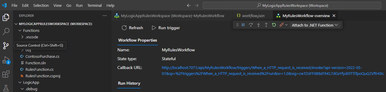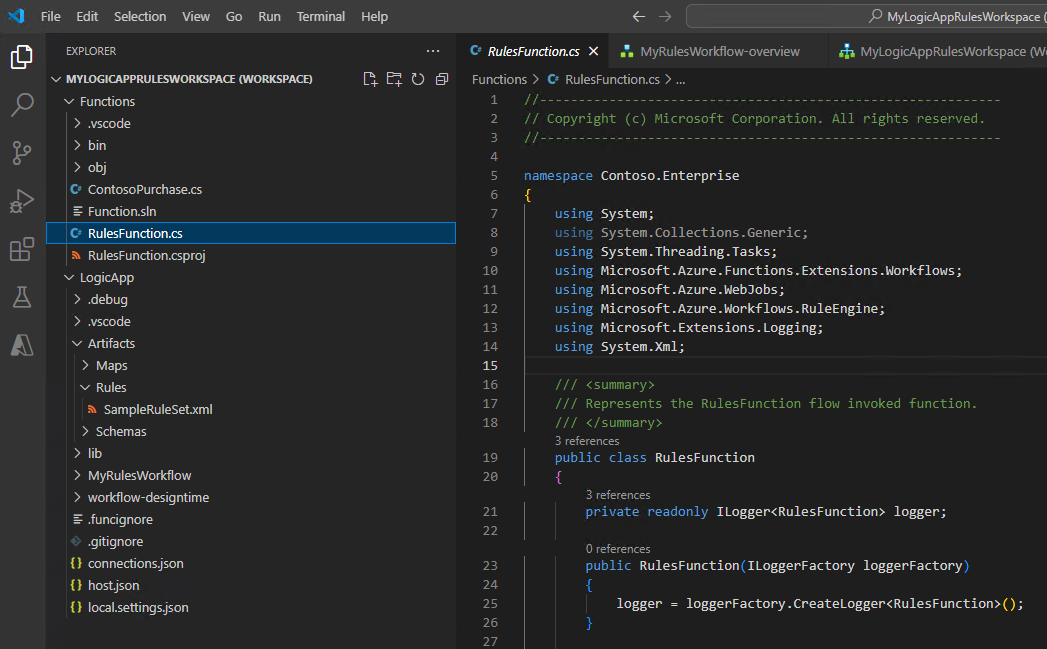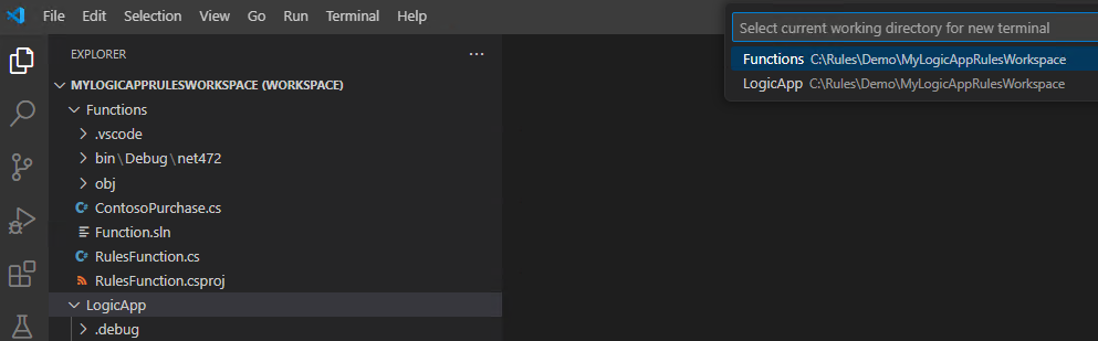 完成此步骤后,Visual Studio Code 会创建工作区,其中默认包括函数项目和逻辑应用规则引擎项目,例如: