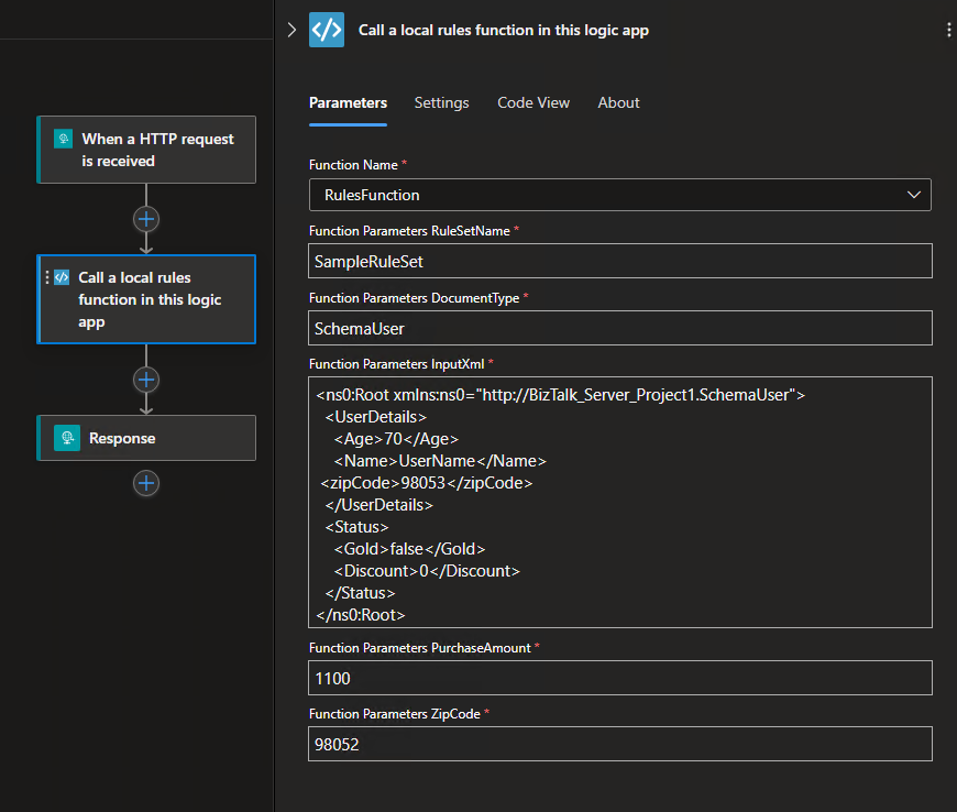 RulesFunction的函数的完整示例代码://------------------------------------------------------------ // Copyright (c) Microsoft Corporation. All rights reserved. //------------------------------------------------------------ namespace Contoso { using System; using System.Collections.Generic; using System.Threading.Tasks; using Microsoft.Azure.Functions.Extensions.Workflows; using Microsoft.Azure.WebJobs; using Microsoft.Azure.Workflows.RuleEngine; using Microsoft.Azure.Workflows.RuleEngine.Common; using Microsoft.Extensions.Logging; using System.Xml; using System.Text; /// <summary> /// Represents the RulesFunction flow invoked function. /// </summary> public class RulesFunction { private readonly ILogger<RulesFunction> logger; private FileStoreRuleExplorer ruleExplorer; public RulesFunction(ILoggerFactory loggerFactory) { logger = loggerFactory.CreateLogger<RulesFunction>(); this.ruleExplorer = new FileStoreRuleExplorer(loggerFactory); } /// <summary> /// Executes the logic app workflow. /// </summary> /// <param name="ruleSetName">The rule set name.</param> /// <param name="documentType">document type of input xml.</param> /// <param name="inputXml">input xml type fact</param> /// <param name="purchaseAmount">purchase amount, value used to create .NET fact </param> /// <param name="zipCode">zip code value used to create .NET fact .</param> [FunctionName("RulesFunction")] public Task<RuleExecutionResult> RunRules( [WorkflowActionTrigger] string ruleSetName, string documentType, string inputXml, int purchaseAmount, string zipCode) { /***** Summary of steps below ***** * 1. Get the rule set to Execute * 2. Check if the rule set was retrieved successfully * 3. create the rule engine object * 4. Create TypedXmlDocument facts for all xml document facts * 5. Initialize .NET facts * 6. Execute rule engine * 7. Retrieve relevant updates facts and send them back */ try { var ruleSet = this.ruleExplorer.GetRuleSet(ruleSetName); // Check if ruleset exists if(ruleSet == null) { // Log an error in finding the rule set this.logger.LogCritical($"RuleSet instance for '{ruleSetName}' was not found(null)"); throw new Exception($"RuleSet instance for '{ruleSetName}' was not found."); } // Create rule engine instance var ruleEngine = new RuleEngine(ruleSet: ruleSet); // Create a typedXml Fact(s) from input xml(s) XmlDocument doc = new XmlDocument(); doc.LoadXml(inputXml); var typedXmlDocument = new TypedXmlDocument(documentType, doc); // Initialize .NET facts var currentPurchase = new ContosoNamespace.ContosoPurchase(purchaseAmount, zipCode); // Provide facts to rule engine and run it ruleEngine.Execute(new object[] { typedXmlDocument, currentPurchase }); // Send the relevant results(facts) back var updatedDoc = typedXmlDocument.Document as XmlDocument; var ruleExectionOutput = new RuleExecutionResult() { XmlDoc = updatedDoc.OuterXml, PurchaseAmountPostTax = currentPurchase.PurchaseAmount + currentPurchase.GetSalesTax() }; return Task.FromResult(ruleExectionOutput); } catch(RuleEngineException ruleEngineException) { // Log any rule engine exceptions this.logger.LogCritical(ruleEngineException.ToString()); throw; } catch(XmlException xmlException) { // Log any xml exceptions this.logger.LogCritical("Encountered exception while handling xml. " + xmlException.ToString()); throw; } catch(Exception ex) { // Log any other exceptions this.logger.LogCritical(ex.ToString()); throw; } } /// <summary> /// Results of the rule execution /// </summary> public class RuleExecutionResult { /// <summary> /// rules updated xml document /// </summary> public string XmlDoc { get; set;} /// <summary> /// Purchase amount post tax /// </summary> public int PurchaseAmountPostTax { get; set;} } } }RulesFunction的函数定义包含一个默认的RunRules方法,可以使用该方法开始操作。 此示例RunRules方法演示如何将参数传递给 Azure 逻辑应用规则引擎。 在此示例中,该方法传递规则集名称、输入文档类型、XML 事实和其他值以供进一步处理。< function-name>.cs 文件还包括