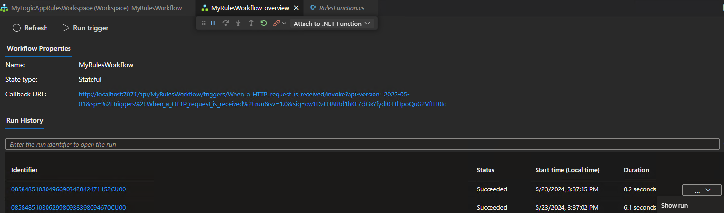从“运行并调试”列表中,选择“附加到逻辑应用 (LogicApp)”(如果尚未选择),然后选择“运行”(绿色箭头)。