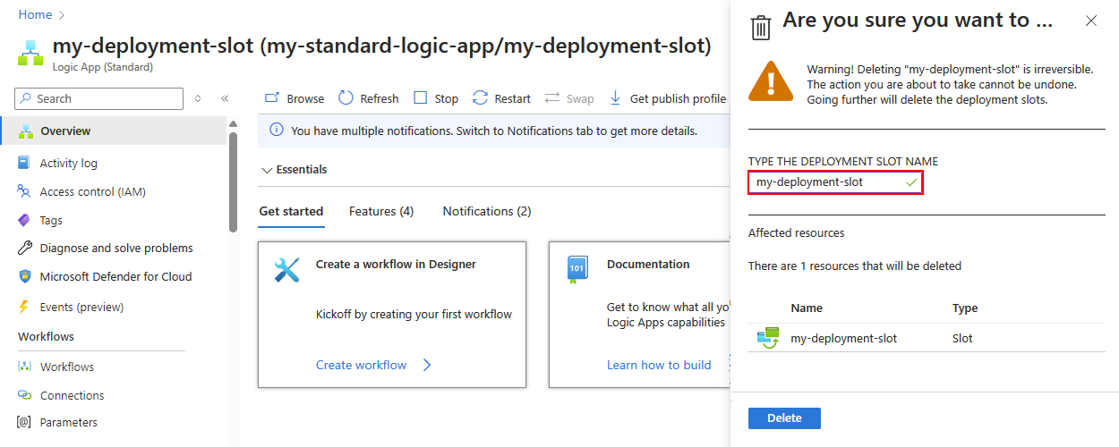 删除部署槽位后,请验证部署的标准逻辑应用资源上是否存在槽位。