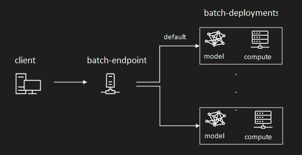 部署是实现终结点提供的功能所需的一组资源和计算。 每个终结点可以托管多个具有不同配置的部署,此功能有助于将终结点的接口与部署定义的实现细节分离。 调用批处理终结点时,它会自动将客户端路由到其默认部署。 可以随时配置和更改此默认部署。