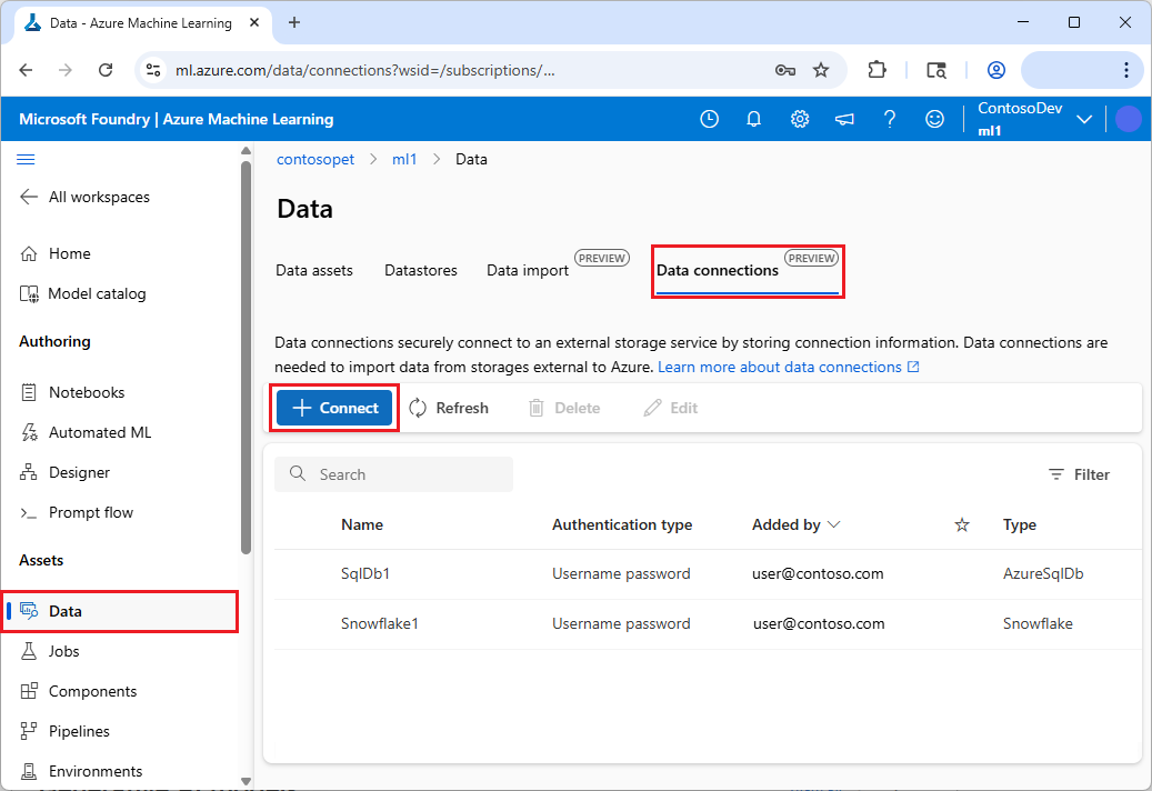 在 Azure 机器学习工作区中,在左侧导航中选择“管理”下的“连接”,然后选择“连接”。