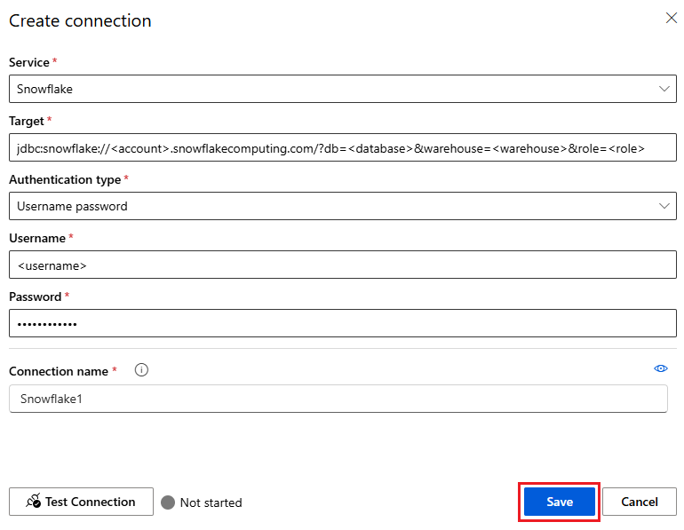 目标:请输入以下目标信息,使用您 Snowflake 帐户中的值替换占位符: