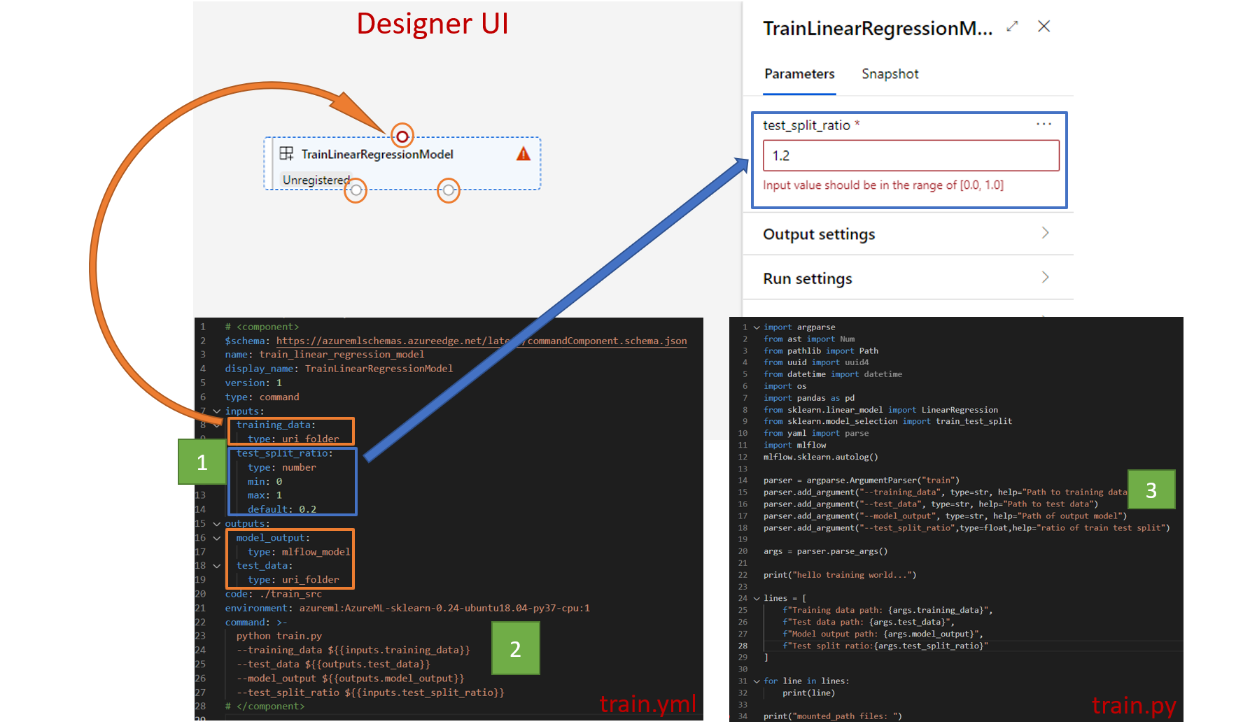 文本值输入(string、、numberinteger)boolean是可以在运行时传递给组件的参数。 可以在 default 字段中添加文字输入的默认值。 对于 number 和 integer 类型,也可以通过使用 min 和 max 字段来添加最小值和最大值。 如果输入值小于最小值或大于最大值,则管道在验证时失败。 提交管道作业之前会进行验证,从而节省时间。 验证适用于 CLI、Python SDK 和设计器 UI。 以下屏幕截图显示了设计器 UI 中的验证示例。 同样,可以在字段中定义允许的值 enum 。
