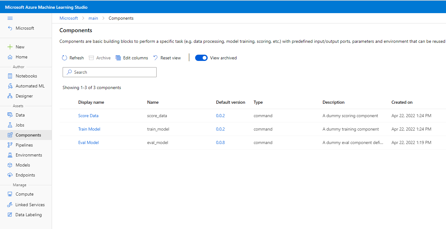 尽管某些组件特定于特定管道,但组件的真正好处来自重用和共享。 可以在机器学习工作区中注册组件,使其可供重复使用。 已注册的组件支持自动版本控制,以便可以更新组件,但确保需要较旧版本的管道将继续工作。
