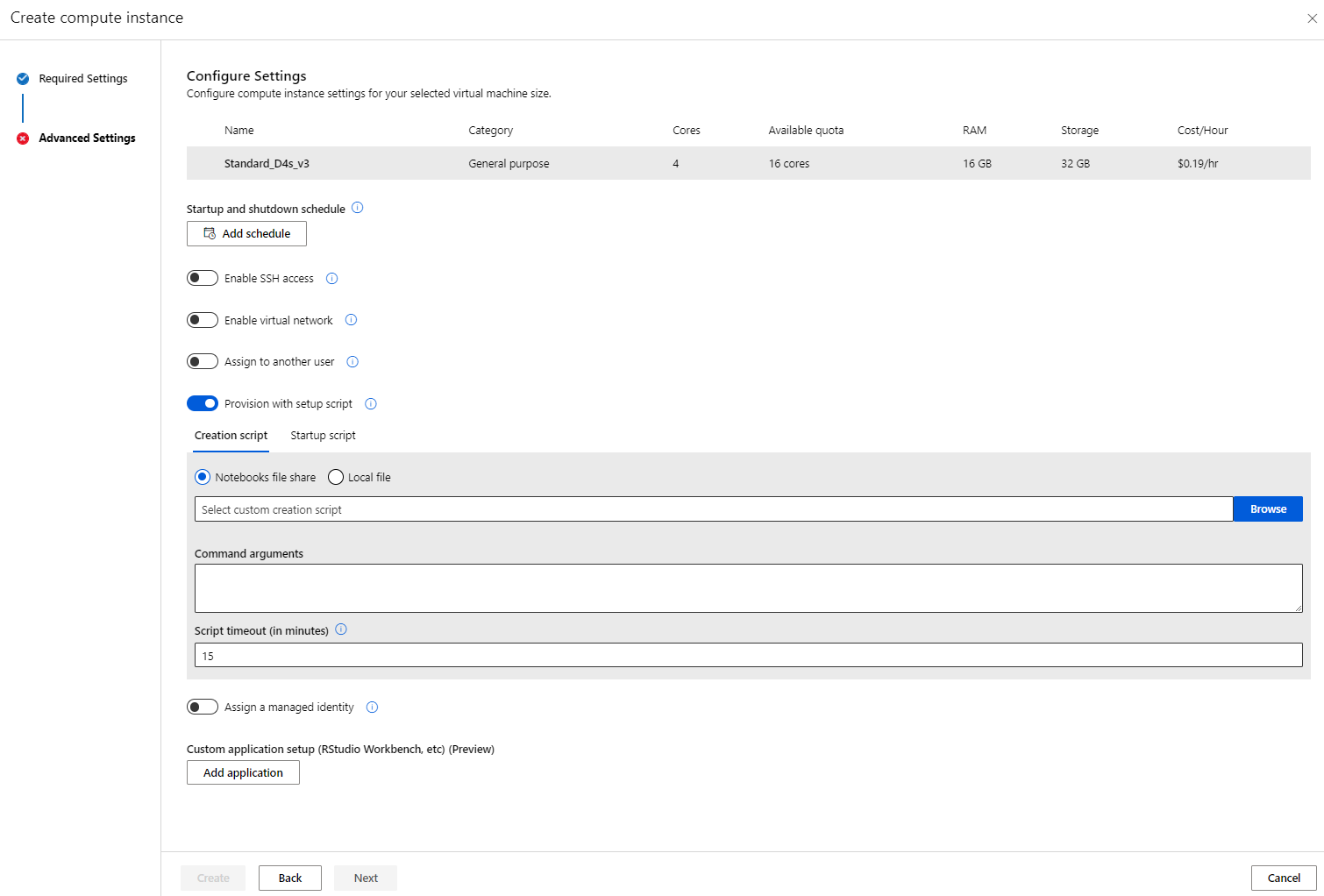 管理员可以编写自定义脚本,根据要求预配工作区中的所有计算实例。 可以将安装脚本配置为: