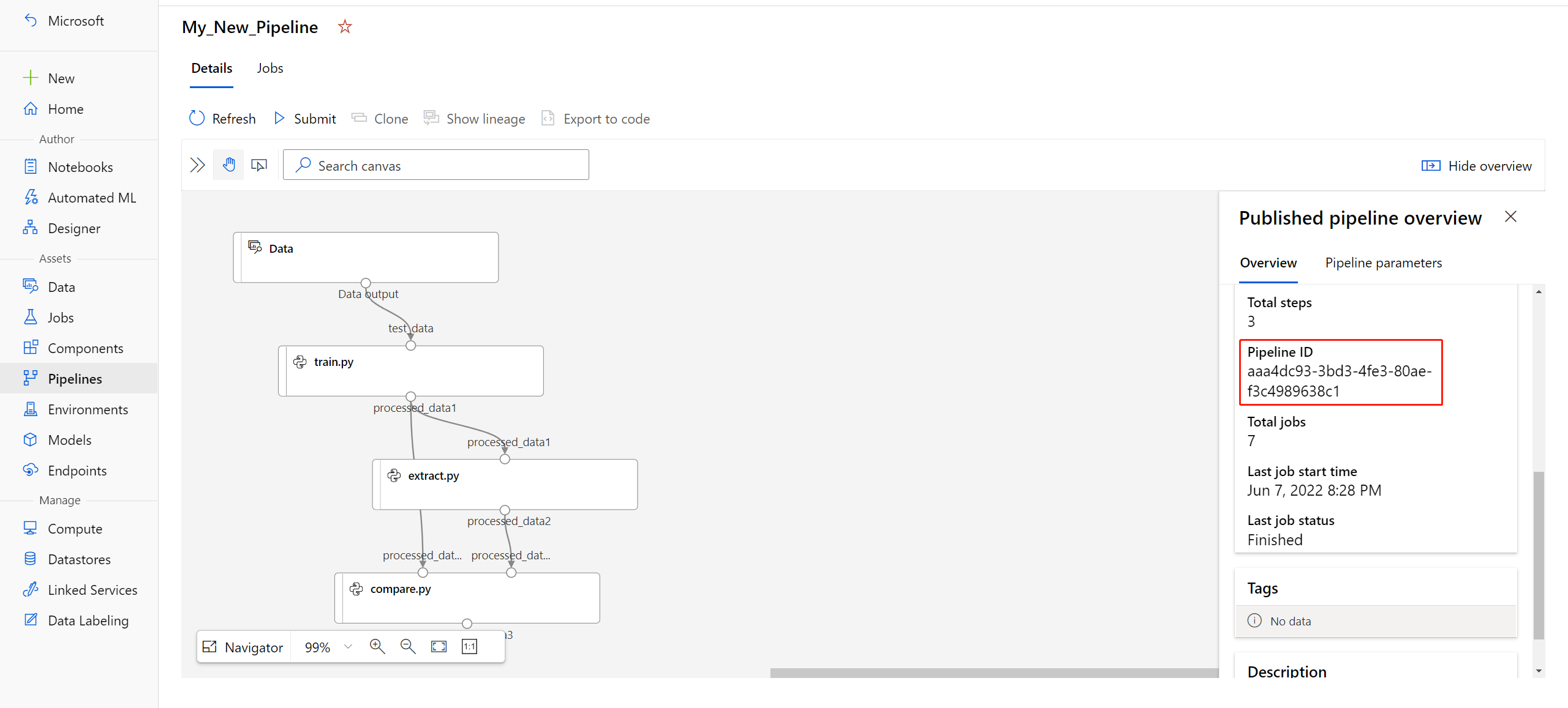 # Get the pipeline by using its ID from Azure Machine Learning studio