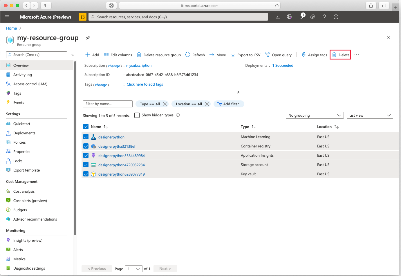 在该容器中,选择并删除要删除的资源,如以下屏幕截图所示: