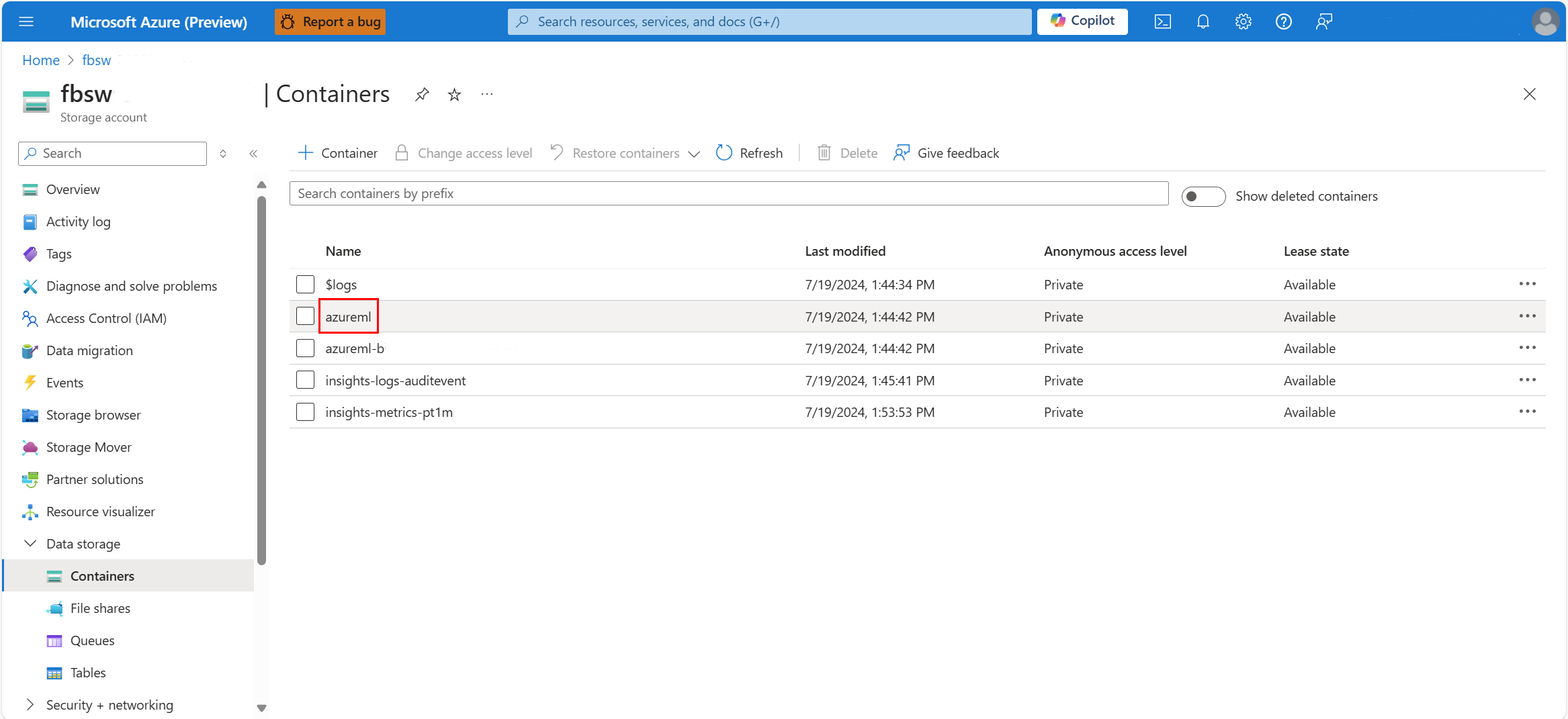 屏幕截图显示在存储帐户页中选择“容器”。