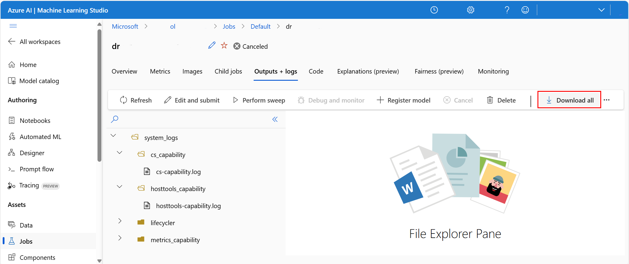 Azure 机器学习工作室可以处理试验作业中的训练项目和日志下载。 在 Azure 机器学习工作室主页上,选择“作业”,如以下屏幕截图所示:
