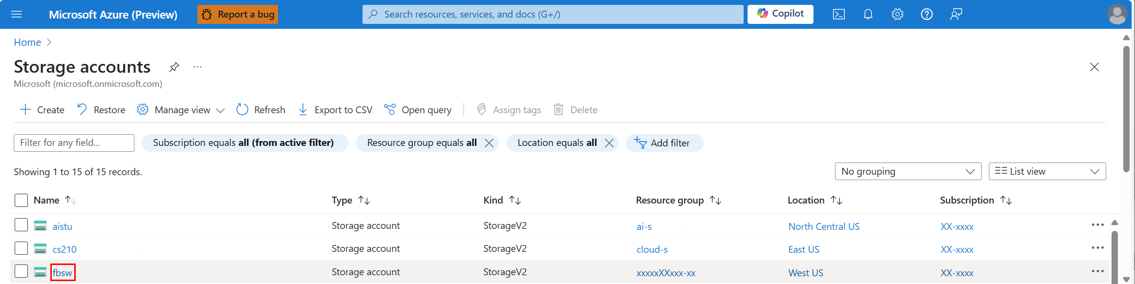 屏幕截图显示选择特定存储帐户。