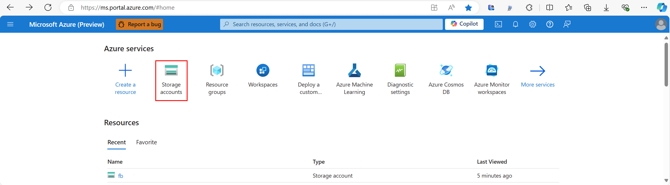 屏幕截图显示在 Azure 门户中选择“存储帐户”。