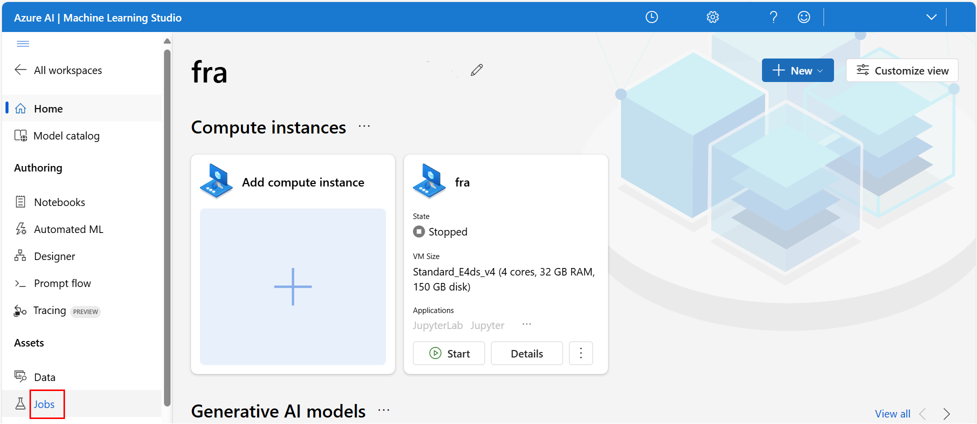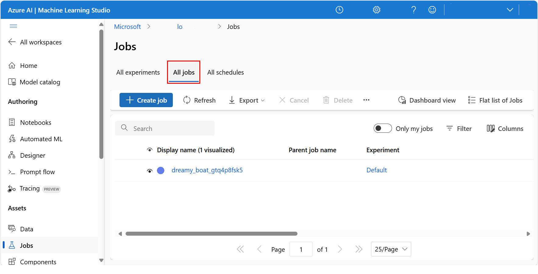 Azure 机器学习工作室可以处理试验作业中的训练项目和日志下载。 在 Azure 机器学习工作室主页上,选择“作业”,如以下屏幕截图所示: