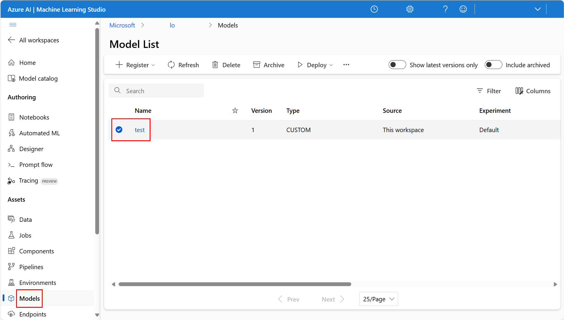 若要下载已注册的模型,请选择“模型”以在 Azure 机器学习工作室中打开“模型列表”,然后选择特定模型,如以下屏幕截图所示: