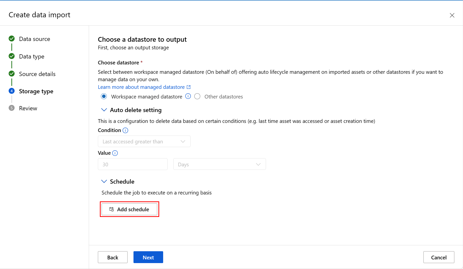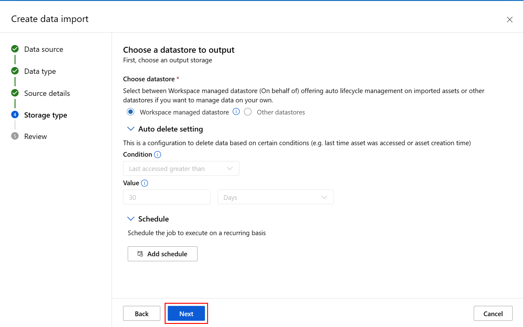 在“选择要输出的数据存储”屏幕上填写值,然后选择“下一步”,如下方的屏幕截图所示。 默认选择“工作区托管数据存储”;选择托管数据存储时,系统会自动分配路径。 如果选择“工作区托管数据存储”,将显示“自动删除设置”下拉列表。 默认情况下会提供 30 天的数据删除时段,如何管理导入的数据资产说明了如何更改此值。