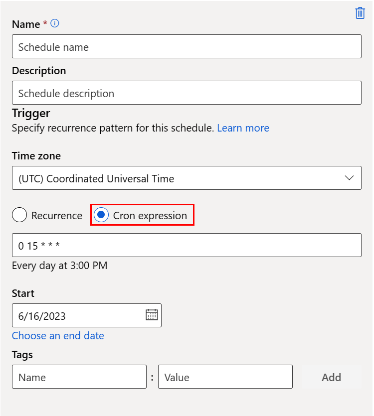 “开始日期”使用计划的时区指定开始日期和时间。 如果省略开始日期,则开始时间等于计划创建时间。 如果开始时间在过去,则第一个作业将在下一个计算的运行时间运行。