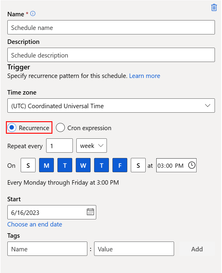 - 重复或 Cron 表达式:选择“重复”以指定重复模式。 在“定期”下,可以指定定期频率 - 按分钟、小时、天、周或月。