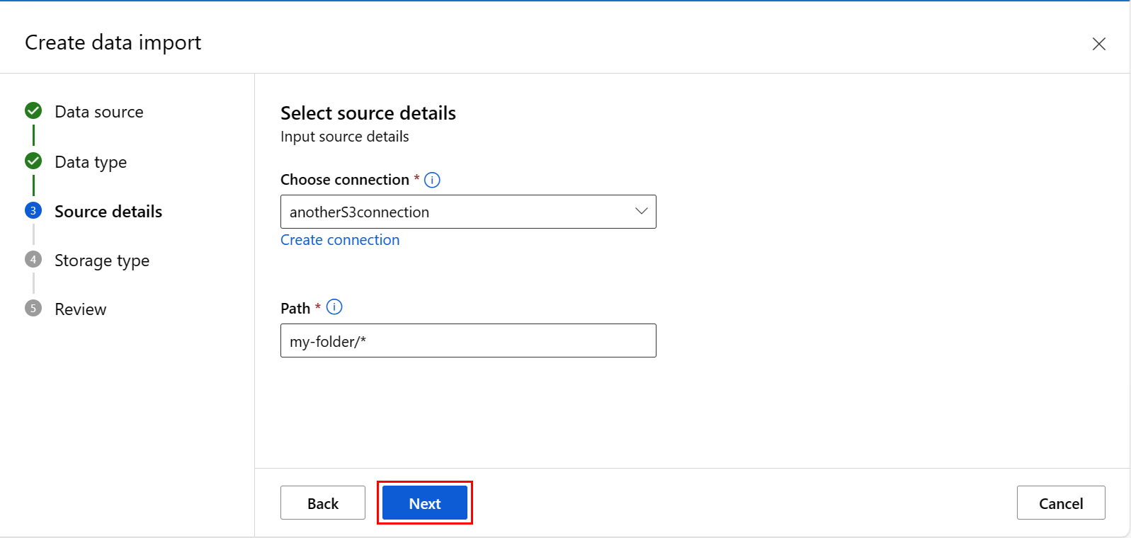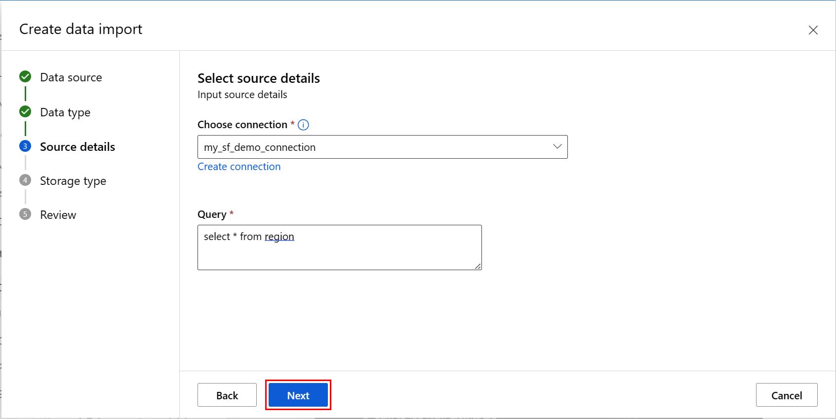 在“创建数据导入”屏幕上填写值,然后选择“下一步”,如下方的屏幕截图所示: