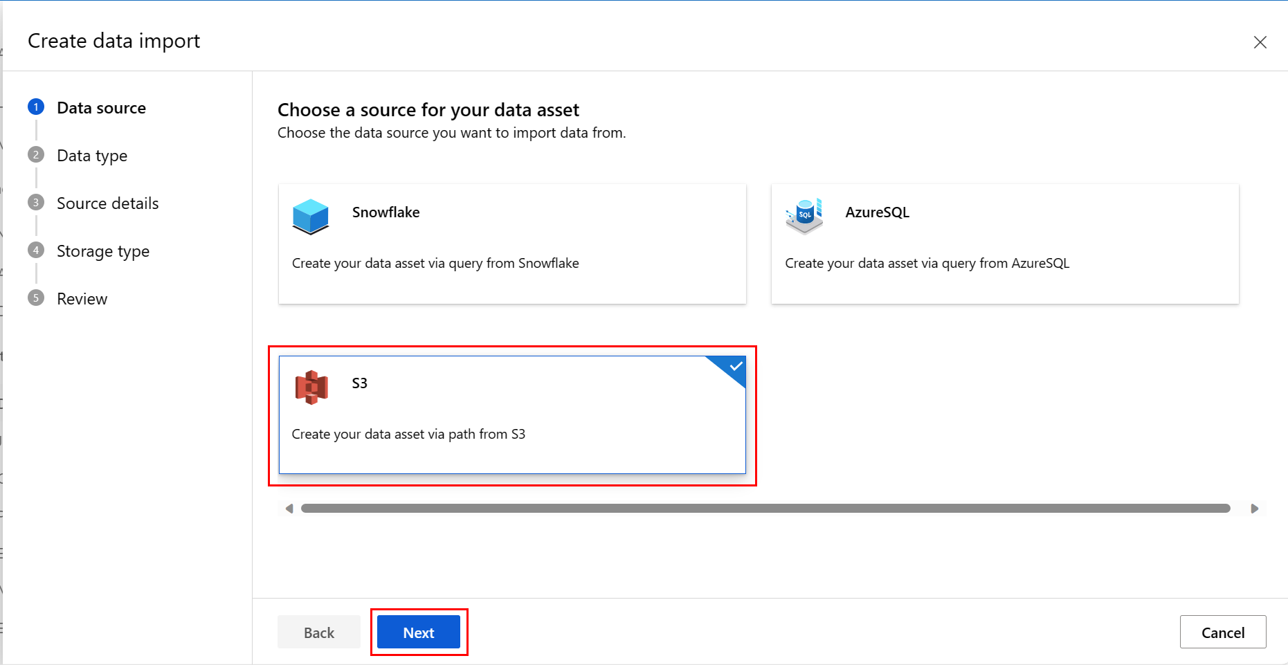 在“数据源”屏幕上,选择“S3”,然后选择“下一步”,如下方的屏幕截图所示: