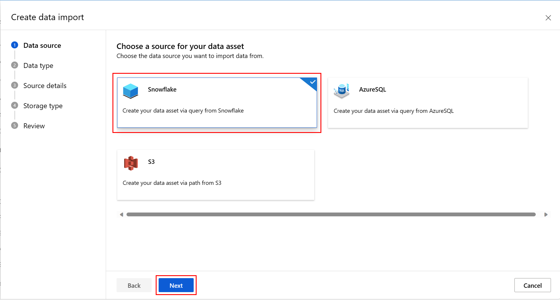在“数据源”屏幕上,选择“Snowflake”,然后选择“下一步”,如下方的屏幕截图所示: