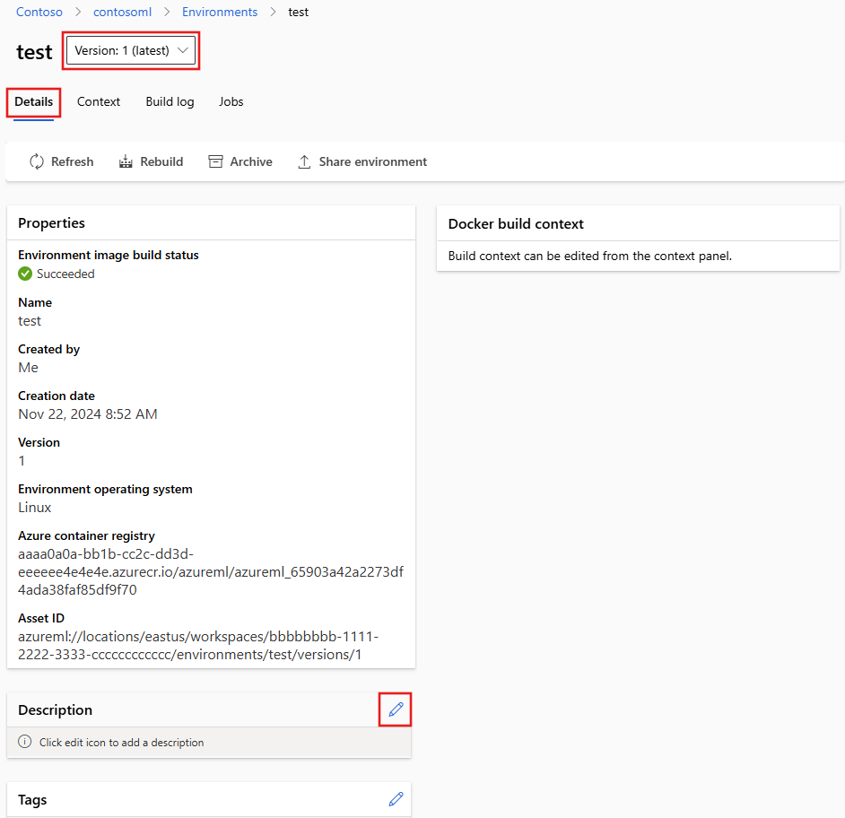 使用“版本”下拉菜单选择环境的不同版本。 在“详细信息”选项卡中,你可以通过环境的各种依赖项查看其元数据和内容。 选择铅笔图标以编辑“说明”和“标记”等字段。