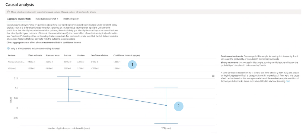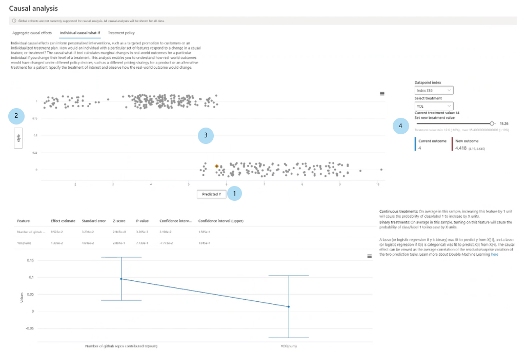 - 选择任何单个数据点,干扰其处理特征,并查看支持因果假设结果的预期因果结果。 此分析仅适用于回归机器学习方案。