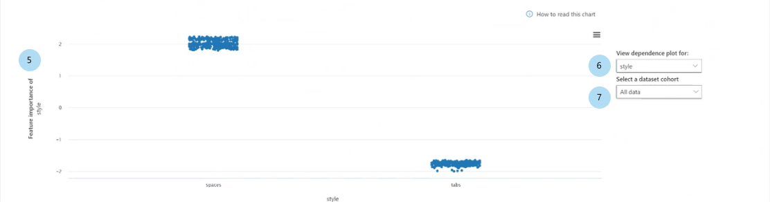 在条形图中选择一个特征时,将填充依赖关系图,如下图所示。 此依赖关系图显示特征值与其影响模型预测的相应特征重要性值之间的关系。