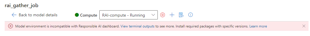 如果连接计算实例的过程耗时过长或仪表板显示红色错误消息栏,则表示启动负责任的 AI 终结点时出现问题。 选择“查看终端输出”,并向下滚动至底部以查看错误消息。