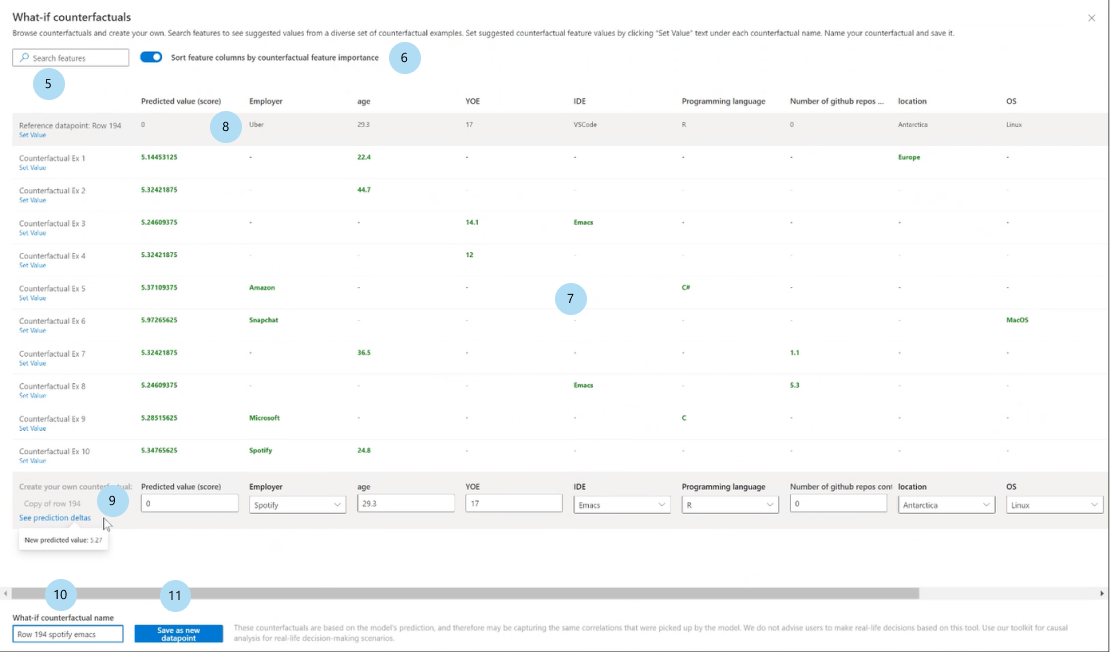 创建自己的反事实:允许干扰自己的特征来修改反事实。 通过标题加粗来表示您对原始特征值进行更改的特征,例如 雇主 和 编程语言。 选择“查看预测增量”查看新预测值与原始数据点的差异。