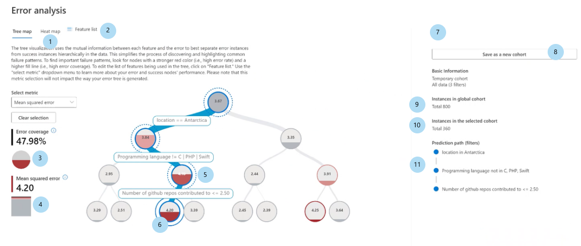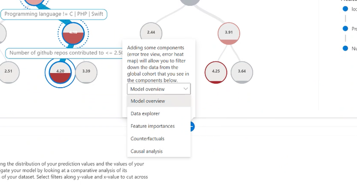 错误分析组件的第一个选项卡是树状图。 它通过树形可视化展示了模型失败如何在各种队列中分布。 选择任意节点以查看发现错误的特征的预测路径。