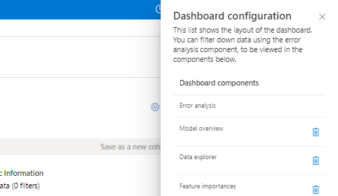 若要查看仪表板上配置的组件列表,请选择 “仪表板配置”。 可以通过选择“垃圾桶”图标隐藏仪表板上的组件,如下图所示:
