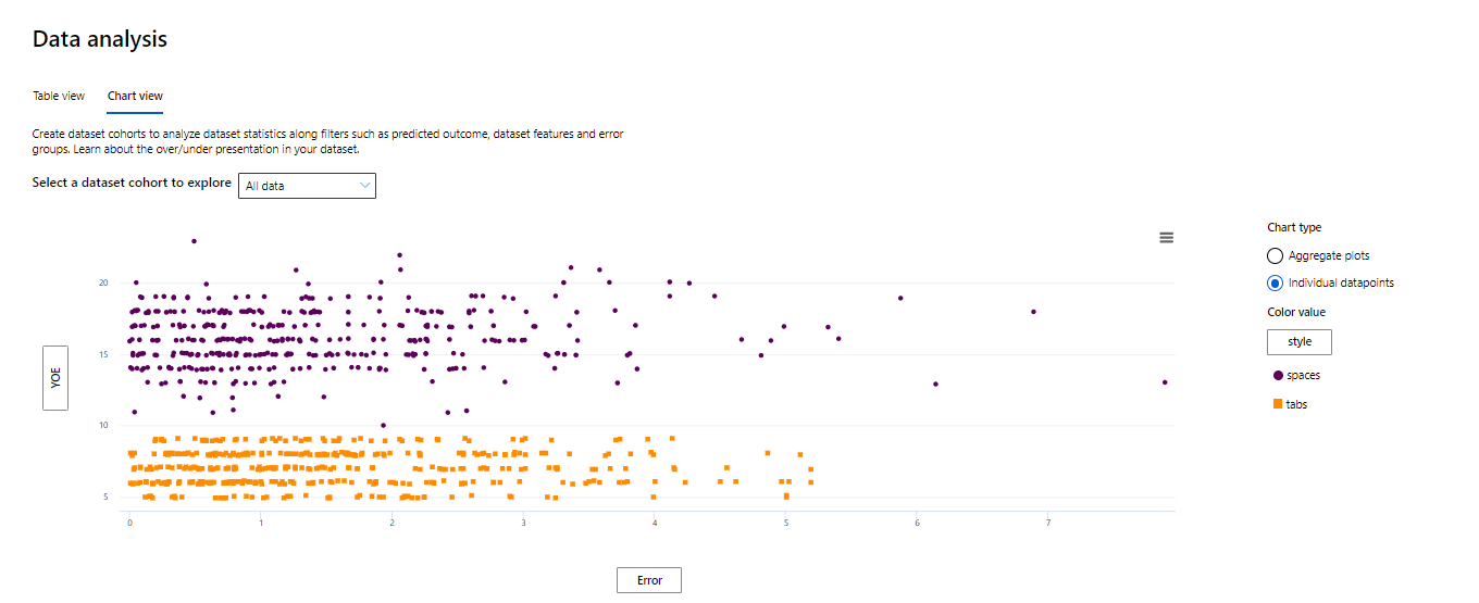 图表视图显示数据点的聚合和单个绘图。 你可以使用预测结果、数据集特征和错误组等筛选器来分析 x 轴和 y 轴上的数据统计信息。 此视图可帮助你了解数据集中的表示过度和表示不足。