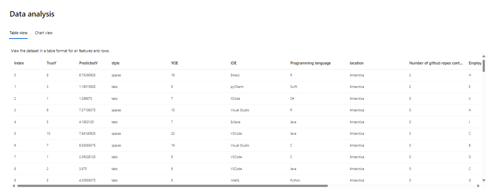 在数据分析组件中, 表视图 显示数据集的所有功能和行的表视图。
