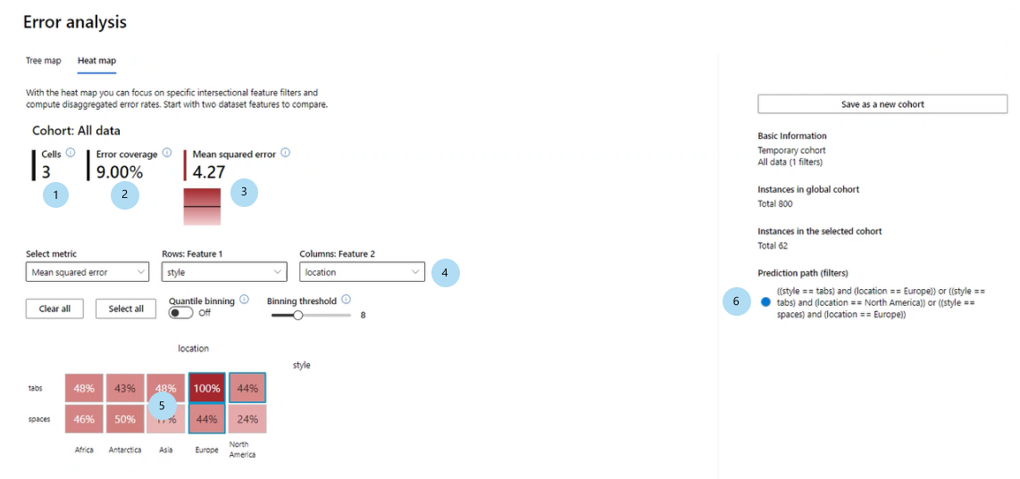 - 单元:表示数据集队列(应用了筛选器),以及队列中数据点总数中错误的百分比。 蓝色边框表示所选单元,红色边框的暗处表示故障的集中。