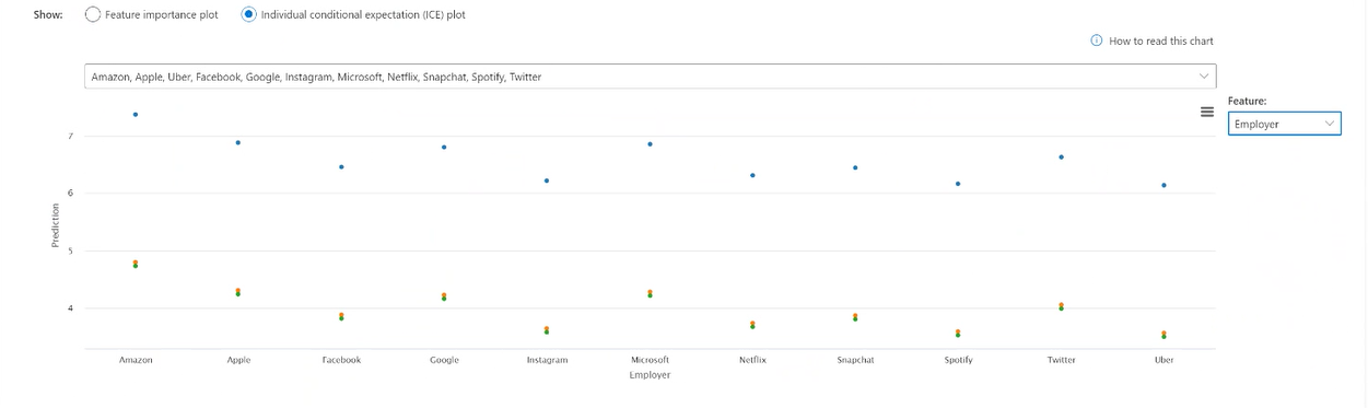 单个条件期望 (ICE) 图:切换到 ICE 图,其中显示特定特征的一系列值的模型预测。