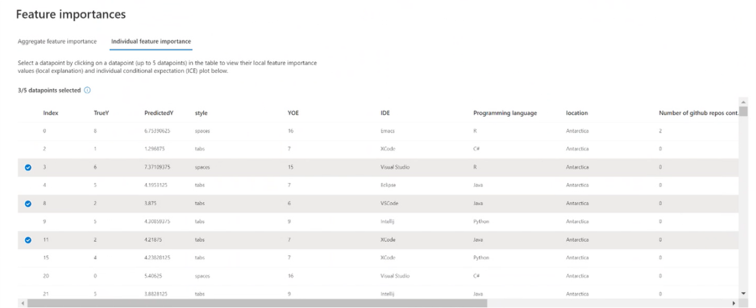 下图演示了特征如何影响对特定数据点做出的预测。 可以选择最多五个数据点来比较特征重要性。