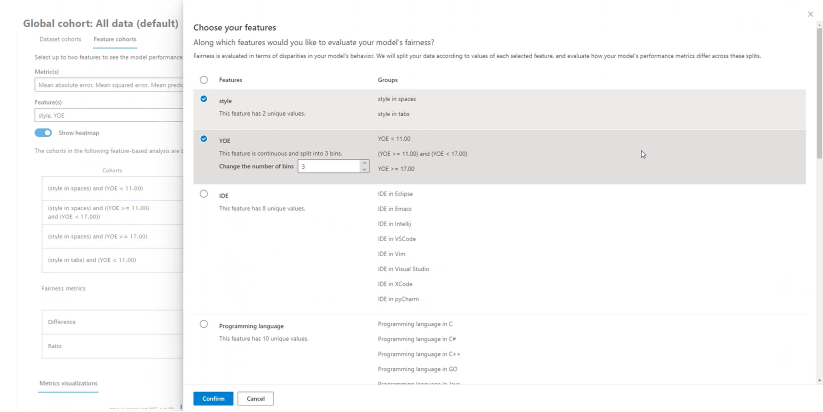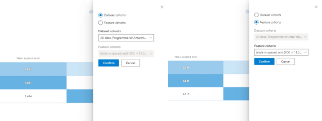 在 功能队列 页上,可以通过比较用户指定的敏感和不区分功能的模型性能来调查模型。 例如,可以比较不同性别、种族和收入水平群体的性能。