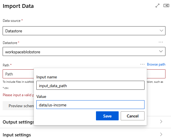 可以将管道输入添加到管道中的数据源或组件参数。 重新提交管道时,可以指定这些输入的值。